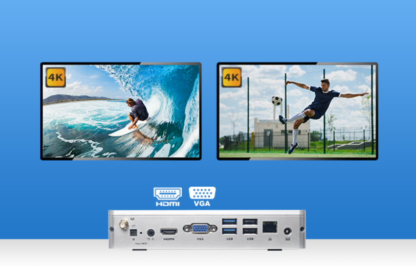 VT26采用JasperLake平臺,搭載N5095處理器,使用IntelUHD Graphics,提供一組HDMI數字顯示接口,支持4K超高清內容顯示,一組VGA模擬顯示接口,最大1080P單屏播放能力,提供高清流暢的桌面體驗,為用戶體驗帶來質的提升。