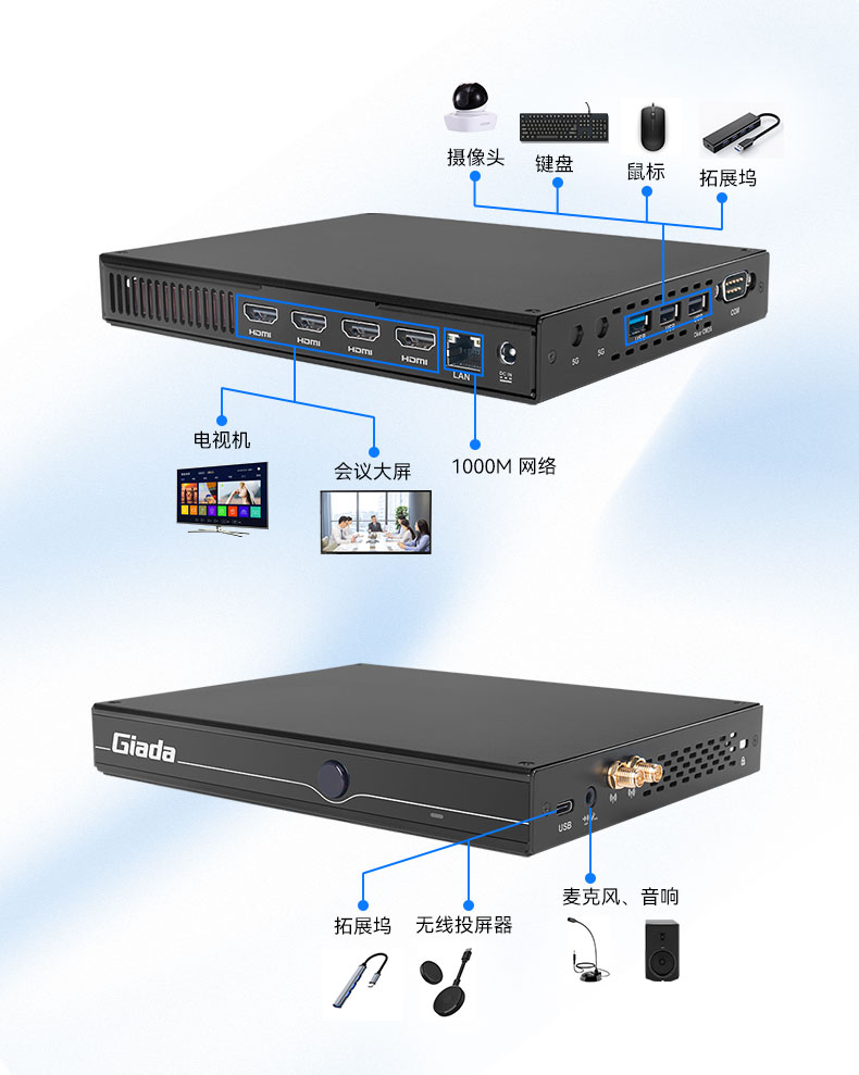 杰和D612采用Intel®第十二代AlderLake處理器i3-1215U、i5-1235,比第11代性能提高19%,Intel® IRIS® Xe GPU (Core i5),圖形性能較上一代提升50%,支持4 x HDMI 2.0接口,提供多達(dá)4屏4K顯示(4096 x 2304@60Hz);支持1 x RJ45千兆網(wǎng)口,1 x E-Key M.2 (2230) for Wi-Fi/BT, 支持Wi-Fi 5, Wi-Fi 6, Wi-Fi 6E (CNVi),具備強(qiáng)大的網(wǎng)絡(luò)通信能力;支持1 x USB Type-C3.1,1 x USB3.1 2 x USB2.0,1 x RS232,1 x二合一音頻接口,拓展能力豐富,可以連接會(huì)議大屏、攝像頭、麥克風(fēng)、音響、U盤、擴(kuò)展塢、無(wú)線投屏等設(shè)備,為企業(yè)帶來(lái)高速網(wǎng)絡(luò)、清晰畫質(zhì)、更優(yōu)質(zhì)、高效的會(huì)議體驗(yàn)。