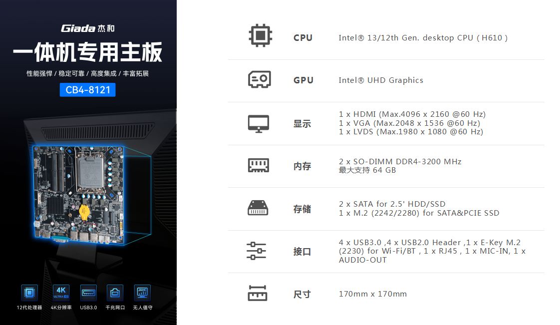 一體機在使用體驗方面也有獨特的優勢:比筆記本屏幕大,比臺式機更簡潔,也解決了一直為人詬病的臺式機線纜多而雜的問題,另外,隨著計算機硬件和制造工藝的不斷發展,一體機的性能也在不斷提高,因此,越來越多的教育辦公、日常娛樂和學習的用戶選擇使用一體機。Giada杰和科技根據市場與客戶需求,推出這款高性能的一體機專研主板CB4-8121,帶來全新震撼體驗。