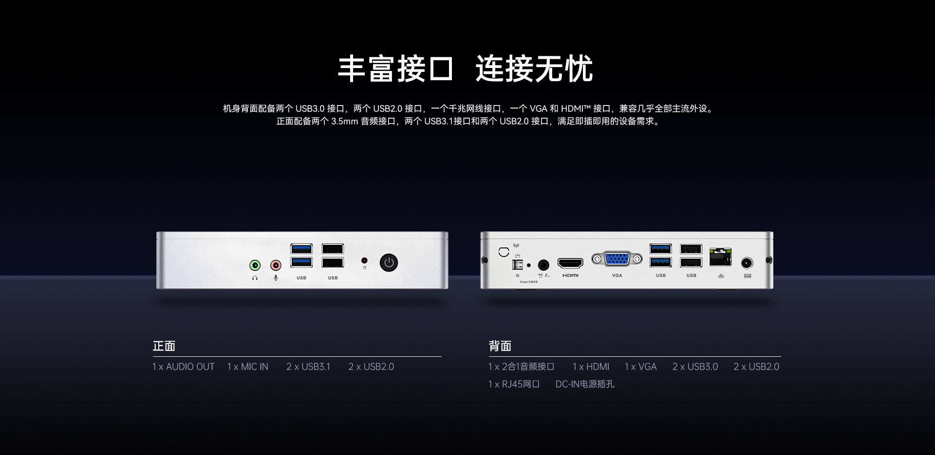 | 音頻接口 | 1 x AUDIO OUT,1 x MIC IN,1 x 2合1音頻接口(后置) | |